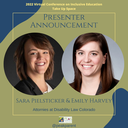 Image: Green background with blue corners. Heading text reading, "2022 Virtual Conference on Inclusive Education: Take Up Space. Presenter Announcement: Sara Pielsticker & Emily Harvey; Attorneys at Disability Law Colorado." PEAK Parent logo at bottom. Centered are two photos of women smiling.